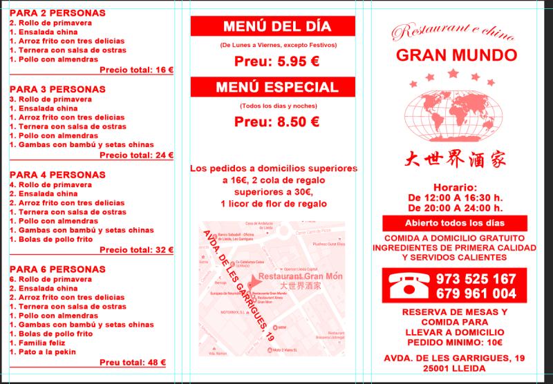 Restaurante chino en Lleida que ofrece diferentes opciones de menú para 2, 3, 4 y 6 personas. Además ofrece menú del día y menú especial.
